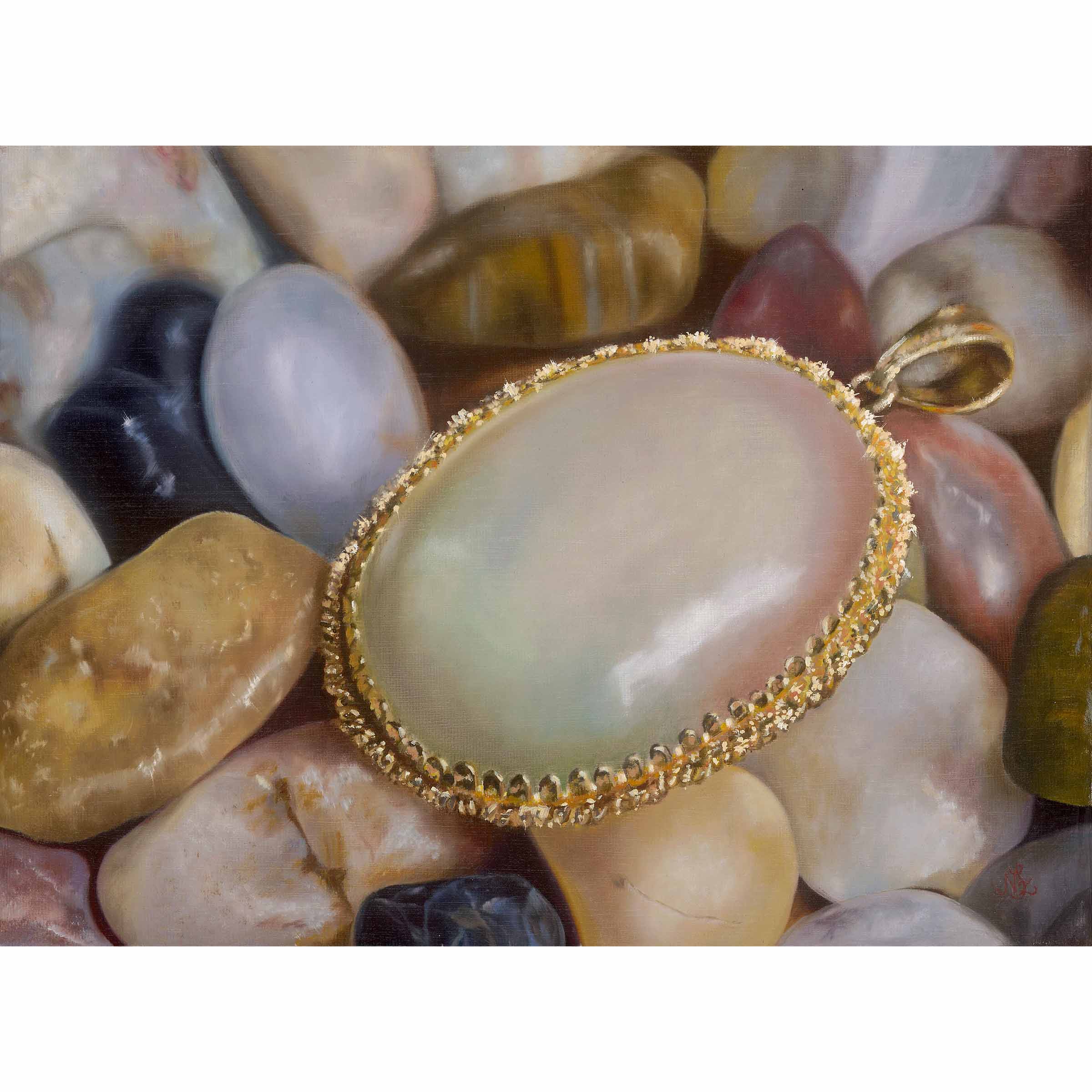 „Kavicsok között” című festményem arra hívja fel a figyelmet, hogy a hétköznapokban rejlő csodák könnyen elkerülhetik a figyelmünket, ha nem állunk meg és nem nézünk alaposabban. Az aranykeret csillogása a belső értékek és a rejtett kincsek szimbóluma.